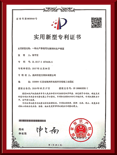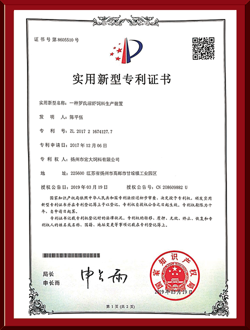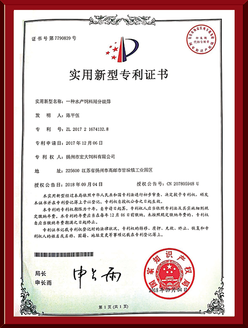 揚(yáng)州市宏大飼料有限公司 揚(yáng)州市宏大飼料有限公司是一家集科研與生產(chǎn)為一體的大型民營企業(yè),座落在魚米之鄉(xiāng)高郵東郊,傍依郵興公路、澄子河,水陸交通便捷,于2002年建成投產(chǎn),占地面積60畝,固定投資1.5億元?,F(xiàn)有7條生產(chǎn)線,其中時產(chǎn)15噸高檔水產(chǎn)膨化生產(chǎn)線2條,均采用國內(nèi)先進(jìn)的真空后噴涂技術(shù)和低溫烘干技術(shù)(飼料內(nèi)的各種營養(yǎng)不受破損)、臺灣宜大高檔蝦料生產(chǎn)線2條和魚飼料生產(chǎn)線3條。